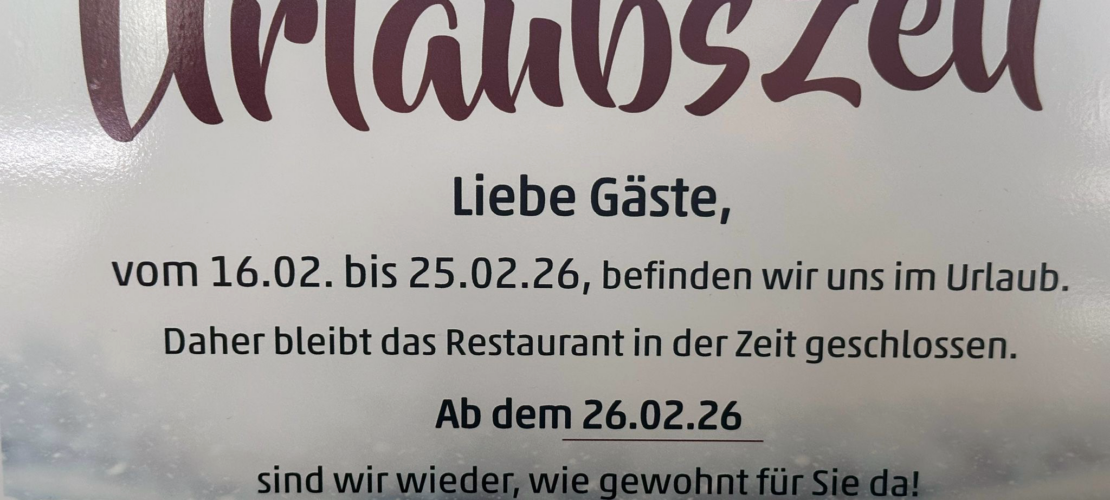 vom 16.02. bis 25.02.2026 befinden wir uns im Urlaub. Daher bleibt das Restaurant in der Zeit geschlossen.